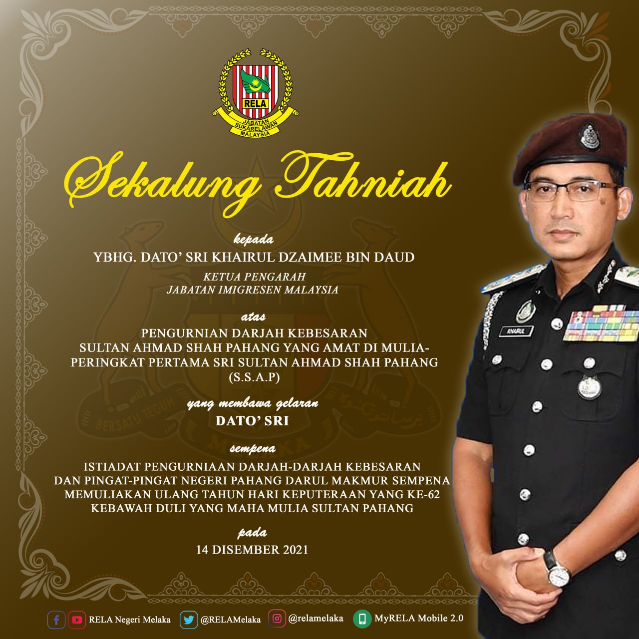 Rela Negeri Melaka On Twitter Sekalung Tahniah Dari Kami Buat Ybhg Dato Sri Khairul Dzaimee Bin Daud Ketua Pengarah Jabatan Imigresen Malaysia πππ πππ ππππ ππππππ Yahyakgc Sazalizin Kdnputrajaya Relamalaysia Faizalhjhusin